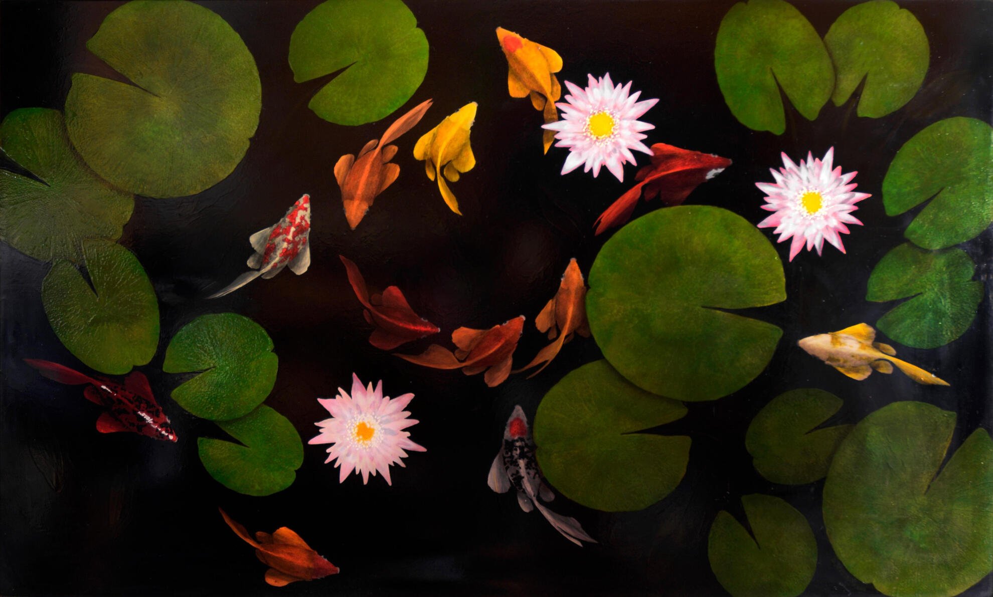 Duane Armstrong's "Koi Pond" is a masterful oil painting that celebrates the serene beauty of aquatic life. Over six months, Armstrong built the painting in 90 meticulous layers, achieving a depth that is almost three-dimensional. The dark, reflective water serves as a canvas, upon which vibrant koi fish adorned in patterns of white, red, and gold glide gracefully. Lush green lily pads and petals of fallen leaves float on the surface, framing the composition, while delicate pink water lilies add a soft contrast to the dark pond. The painting's richness and detail invite the viewer to pause and absorb the tranquil scene, a testament to Armstrong's dedication to his craft.