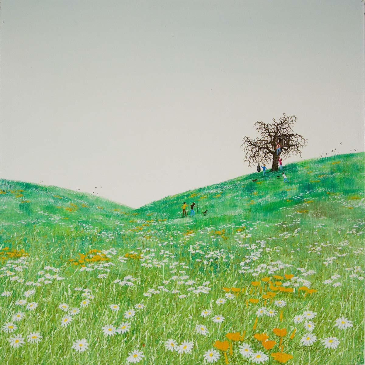 Duane Armstrong's "Grass Swing" is a charming portrayal of bucolic tranquility. In this serene landscape, the eye is led over a sea of wildflowers, their white and yellow blossoms peppering the verdant meadow. A singular, leafless tree stands atop a gentle hill, under which a swing hangs, inviting a moment of playful respite. Tiny figures in the distance add a touch of life, suggesting a narrative of leisure and connection with nature. The use of light and the vastness of the open sky impart a sense of endless possibility. This piece, having found its way into 3,500 department stores, speaks to the universal appeal of Armstrong's idyllic and peaceful scenes.