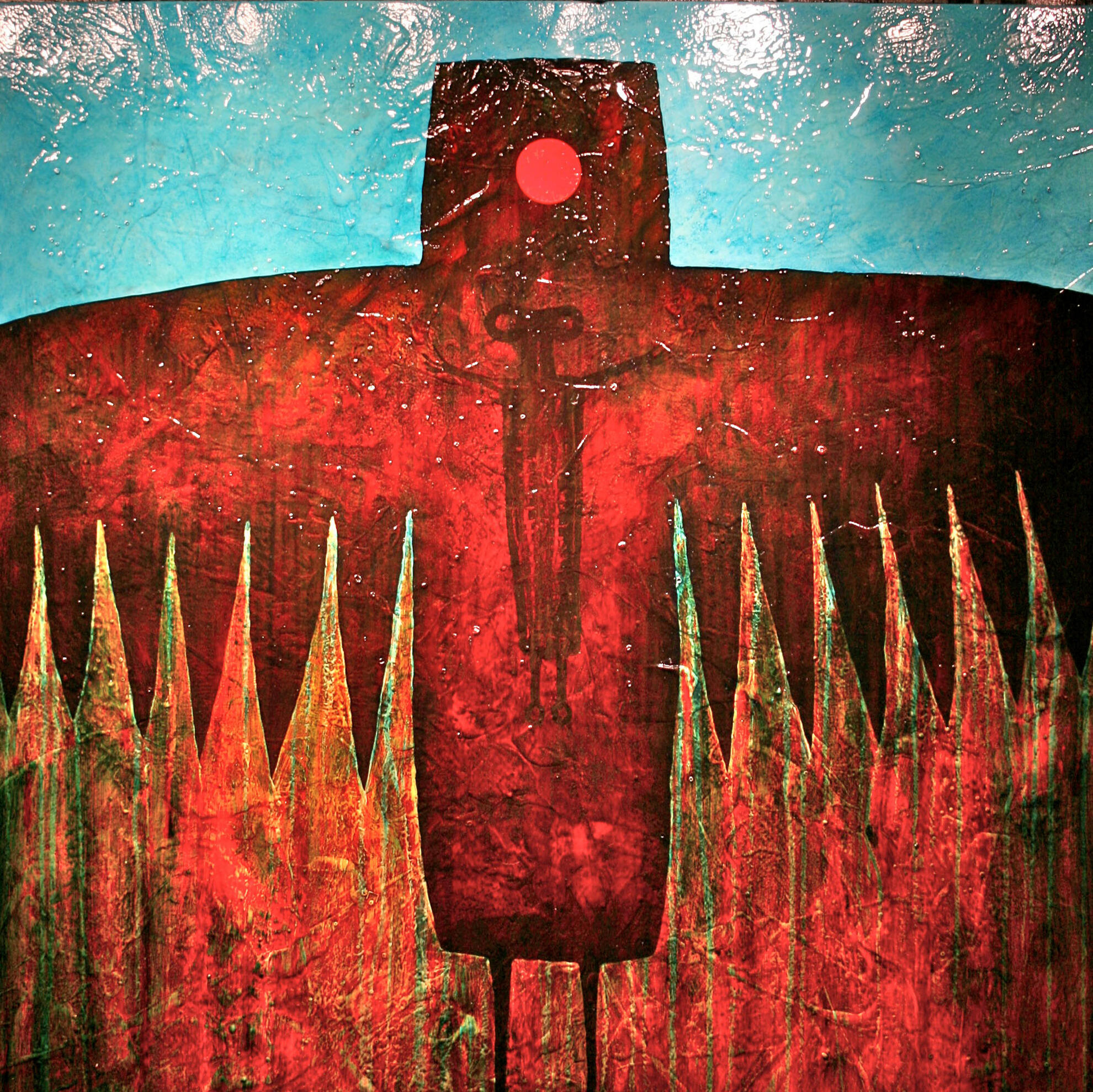 "Birdman" by Duane Armstrong is a striking abstract work, dividing its canvas between the tranquil blue of the sky and the fiery red of the earth. A central, totemic figure resembling a bird merges with these elements, its silhouette marked by a sun-like orb at the head and root-like talons at the base. Green and golden spikes at the bottom suggest growth or energy. The painting's rich textures and contrasting colors create a dynamic visual narrative that is both earthy and ethereal, evoking themes of nature and spirituality.